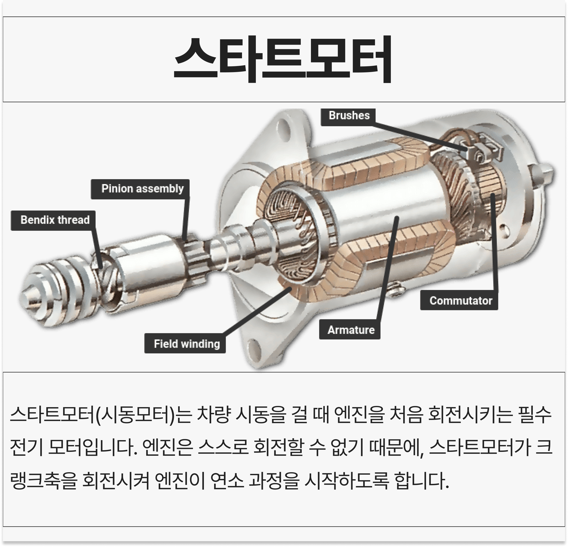 ์ฆ, ์คํํธ๋ชจํฐ๋ ๋ฐฐํฐ๋ฆฌ ์ ๋ ฅ์ ๊ฐ๋ ฅํ ํ์ ๋ ฅ์ผ๋ก ๋ณํํด ์์ง์ ๊นจ์ฐ๋ ์ญํ ์ ํ๋ฉฐ, ์ฐจ๋ ์ดํ์ ์์์ ์์ ๋งค์ฐ ์ค์ํ ์ญํ ์ ํ๋ ํต์ฌ ๋ถํ์