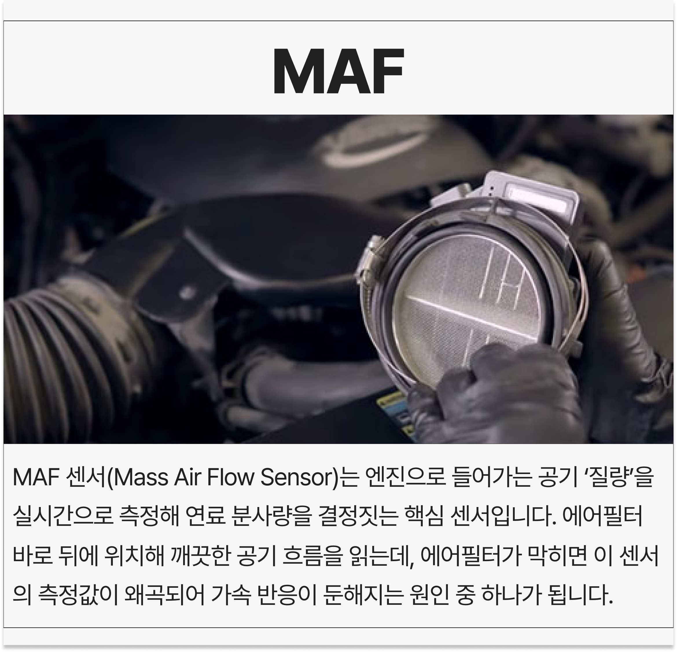 MAF ์ผ์(Mass Air Flow Sensor)๋ ์์ง์ผ๋ก ๋ค์ด๊ฐ๋ ๊ณต๊ธฐ โ์ง๋โ์ ์ค์๊ฐ์ผ๋ก ์ธก์ ํด ์ฐ๋ฃ ๋ถ์ฌ๋์ ๊ฒฐ์ ์ง๋ ํต์ฌ ์ผ์์