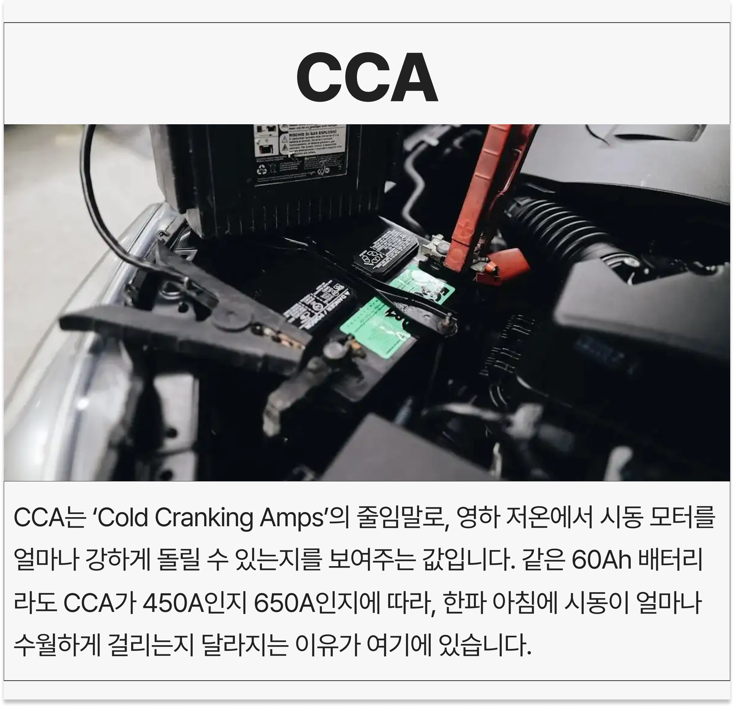 ๋๋ค. ๊ฐ์ 60Ah ๋ฐฐํฐ๋ฆฌ๋ผ๋ CCA๊ฐ 450A์ธ์ง 650A์ธ์ง์ ๋ฐ๋ผ, ํํ ์์นจ์ ์๋์ด ์ผ๋ง๋ ์์ํ๊ฒ ๊ฑธ๋ฆฌ๋์ง ๋ฌ๋ผ์ง๋ ์ด์ ๊ฐ ์ฌ๊ธฐ์ ์์ต๋๋ค.