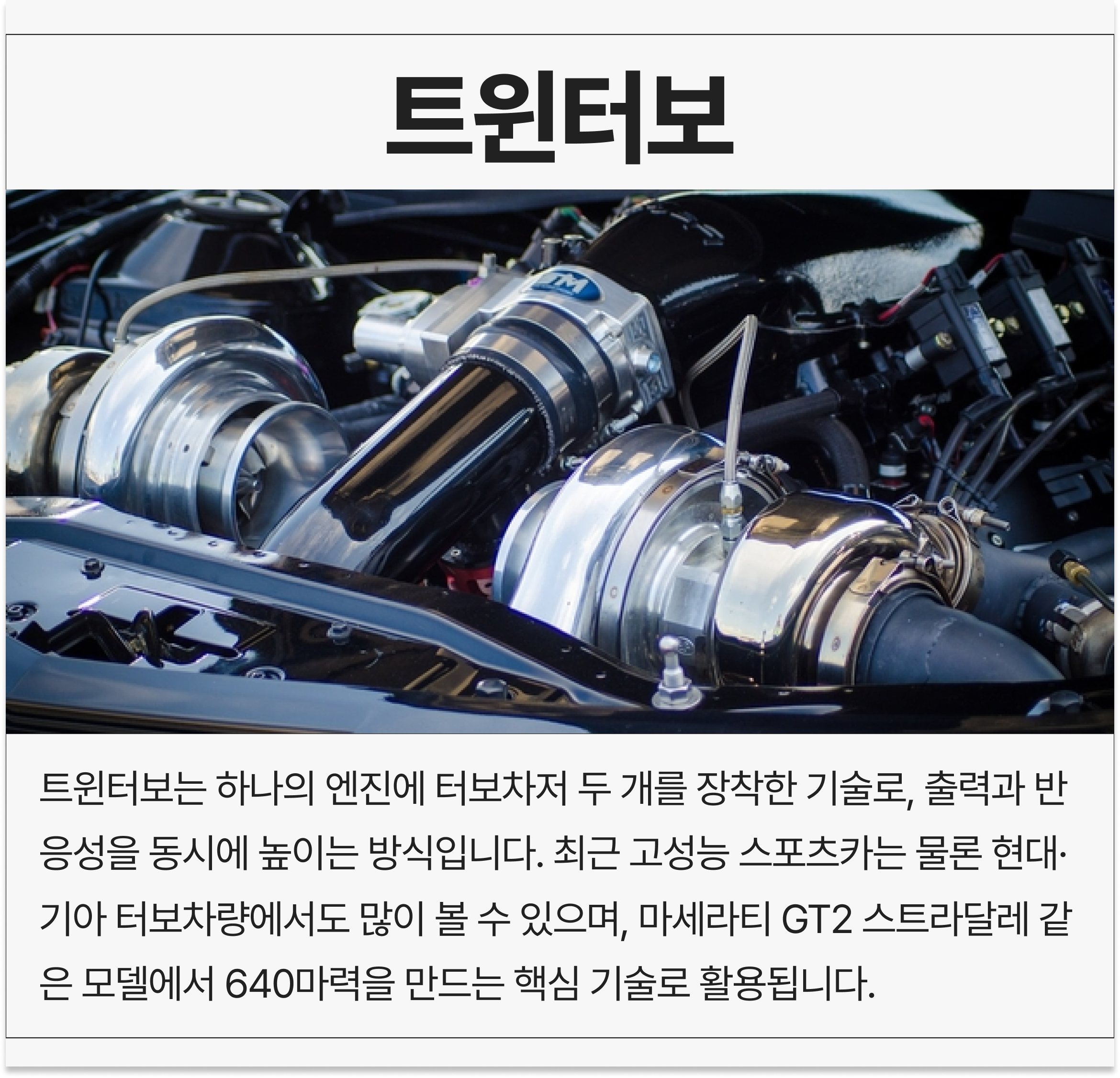 ์ฑ๊ธ ํฐ๋ณด์ ๋จ์ ์ธ ํฐ๋ณด๋์ ํด๊ฒฐํ๋ฉด์๋ V8ยทV12๊ธ ์ถ๋ ฅ์ ์ํ ์์ง์์ ๊ตฌํํฉ๋๋ค. ์๋ฅผ ๋ค์ด 3.0L ํธ์ํฐ๋ณด ์์ง์ด 600๋ง๋ ฅ์ ๋ด๊ฑฐ๋, 2.0L ํธ์ํฐ๋ณด๊ฐ 400๋ง๋ ฅ์ ๋ด๋ ๊ฒ ํ์ค์ด ๋์ต๋๋ค. ์ฐ๋น ํจ์จ๋ ์ข์ ๋ค์ด์ฌ์ด์ง ์๋์ ํ์ ๊ธฐ์ ๋ก ์๋ฆฌ ์ก์์ต๋๋ค.